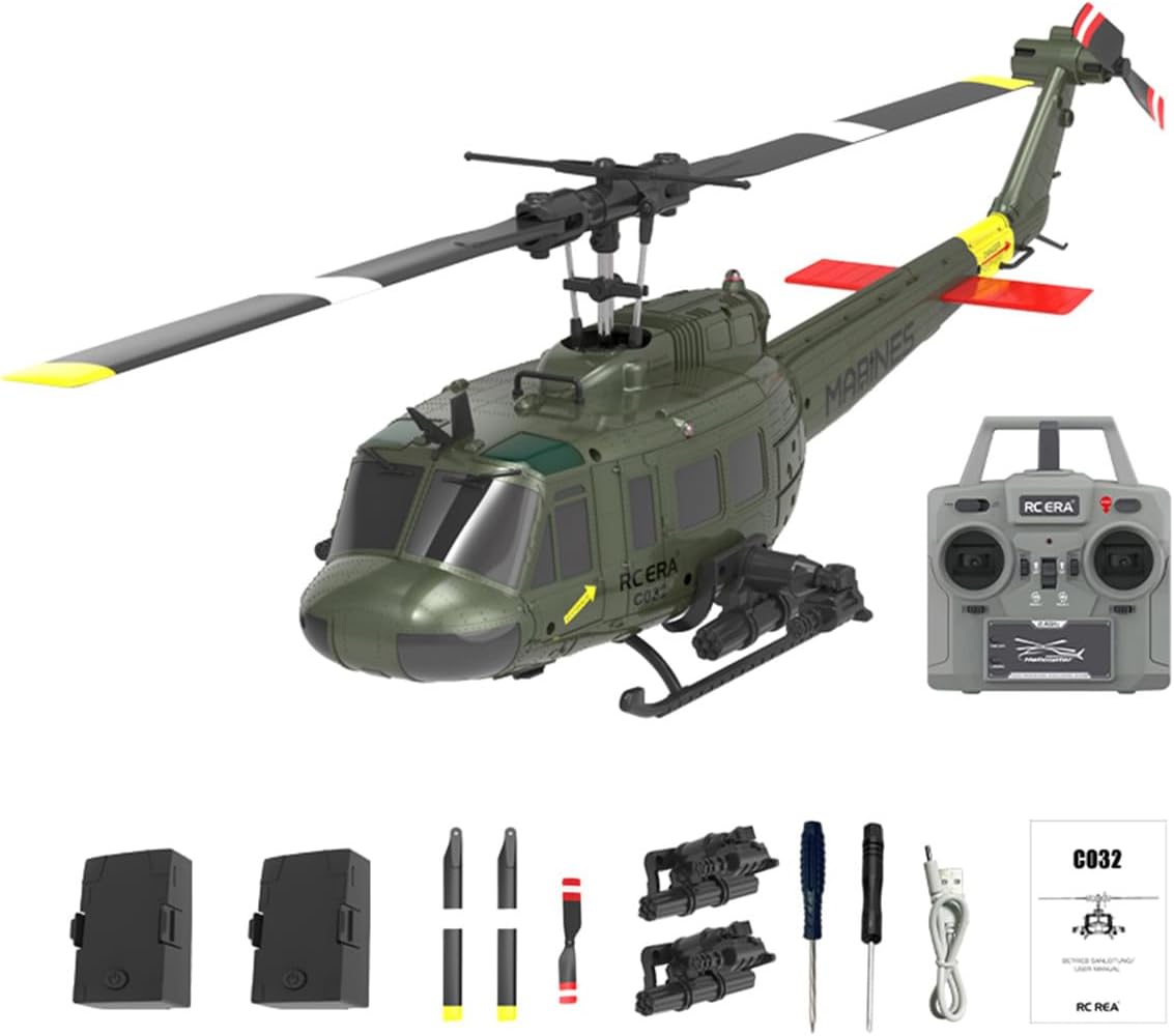 C032 Remote Control Helicopter 1/48 Scale UH-1 Helicopter Model with Optical FlowPositioning, RC Helicopter for Adults, 1/48 C032 RC Helicopter UH-1 Remote Control Helicopter for Adults Outdoor, RC Helicopter Military RC Armed Helicopter, UH-1 Helicopter with a 6-axis Gyroscope, Outdoor RC Helicopter Model Toy Gift (RTF Version, Dark Blue 1, 3 Batteries) Specifications: .Made of: PA/PC.Color: Dark Blue.Item Number: C032.Single Aircraft Weight: 115g.Product Battery: 7.4V Battery.Remote Control Distance: 80-100 meters.Flight Time: 13 minutes.Charging Time: 70 minutes.Product Weight: 660g.Package Weight: 800g.Product Dimensions: 29.7 x 31.5 x 9.2cm.Package Dimensions: 34.5x 22.2 x 9.2cm.Packing: Graphic Carton.Ages: 16+Package Including: .RC Helicopter Model *1.Remote control *1.Manual *1.USB charger *1.Main propeller *2.Tail propeller *1.Battery *3.Screwdriver *1.Hexagonal wrench*1.Graphic Carton *1