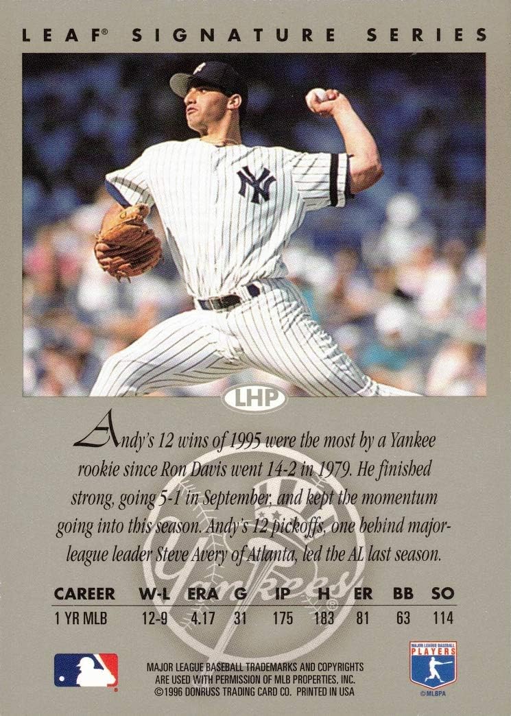 1996 Leaf Signature Series Silver Andy Pettitte Authentic Autograph Baseball Card - New York Yankees. This is an original, authentic baseball card of Andy Pettitte produced by Donruss (Leaf cards are made by Donruss) in 1996. There is no Certificate of Authenticity with this card but that was normal for Leaf. They have an excellent reputation within the trading card industry of their signatures being authentic. Card is in Near Mint to Mint condition.