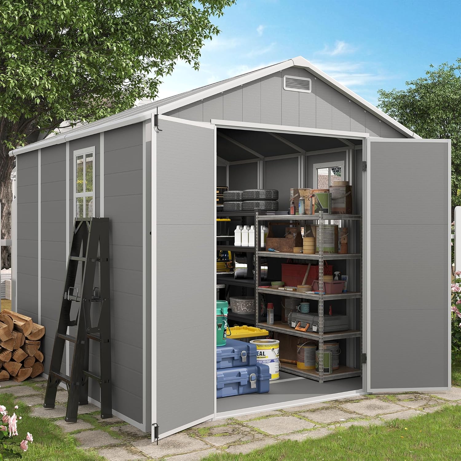 This resin storage shed with floor is designed for durable, all-weather outdoor storage, providing a reliable solution for organizing lawn mowers, bikes, garden tools, outdoor cushions, and seasonal equipment. Built with high-density reinforced resin, this outdoor storage shed is lightweight yet exceptionally strong, resisting warping and rotting like wood and preventing rust or dents common with metal sheds, while requiring minimal maintenance. The integrated floor base offers stable support for heavy equipment without sagging and helps keep stored items elevated from ground moisture, making it ideal as a tool shed, garden shed, or bike storage shed. Featuring lockable double doors for added security and wide access, this resin shed supports efficient vertical and horizontal storage. Available in multiple sizes including 6Ć6, 8Ć6, 8Ć8, 8Ć10, and 8Ć12 ft, it fits a variety of backyards, patios, and garden spaces as a long-lasting, low-maintenance outdoor storage solution.
