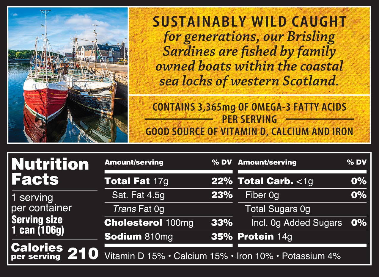 Product Description Crown Prince Brisling Sardines are one of nature's most perfect foods. Naturally nutritious, these sardines boast delicate flavor and firm texture. All varieties are lightly smoked and hand packed. We only source the highest quality Brisling Sardines, which are available in a variety of sauces and oils. Just one can provides one-third of the protein needed every day. Brisling Sardines are an excellent source of calcium, and contain 2 grams of omega-3 per serving. Try them in salads, casseroles, sandwiches or chowders. About the Brand Since 1948, Crown Prince Inc. has provided the finest-quality canned seafood available to customers across the nation. As an American family-owned business, three generations of the Hoffman family have dedicated themselves to meeting the needs of the consumer. Today, the Crown Prince brand is well-known throughout the country.