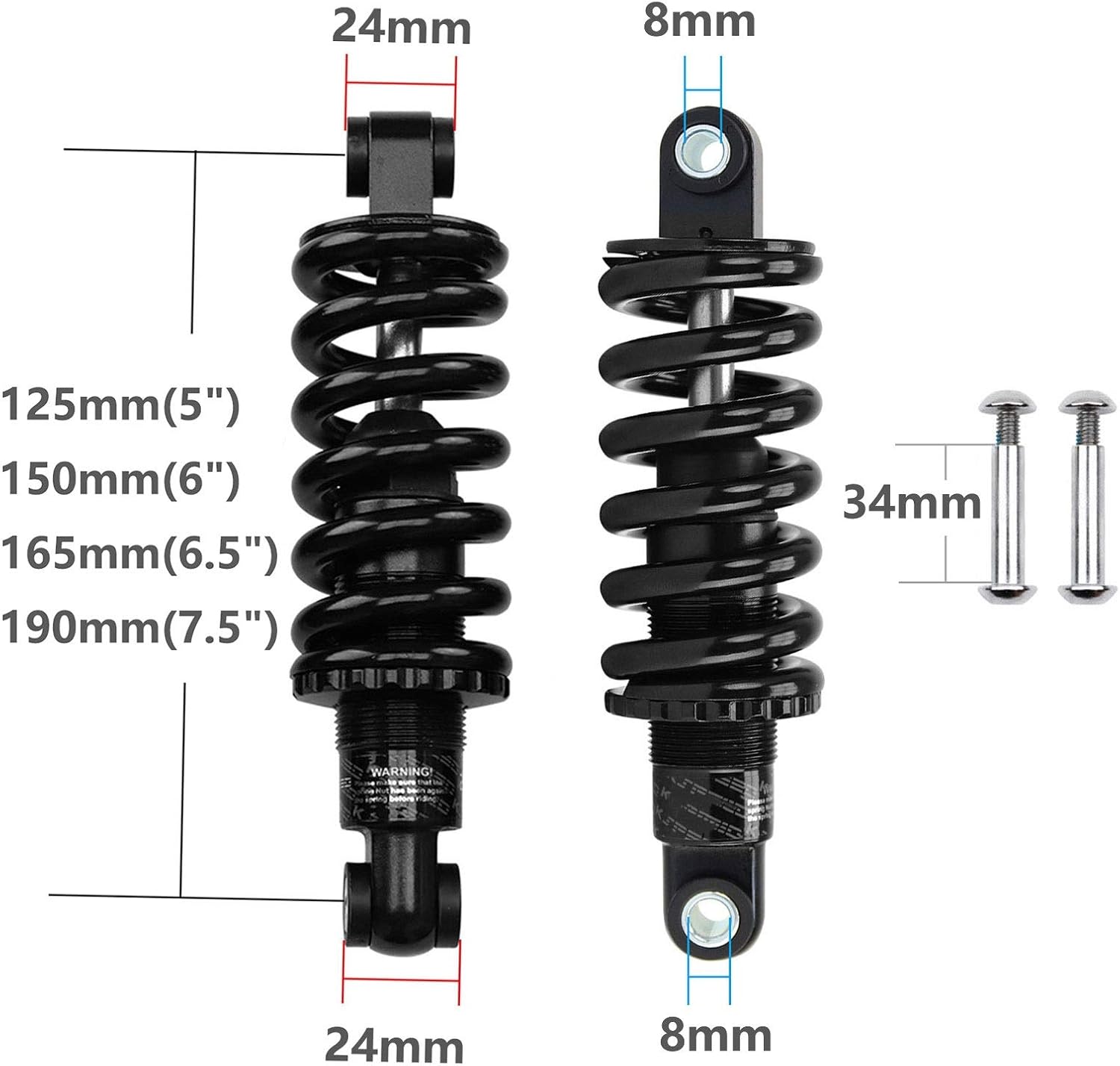🚲 SHOCK DESCRIPTION:◆ Product: Shock absorber◆ Spot (Can be ordered in bulk)◆ Spring type: Coil.◆ Length: 125mm(5"), 150mm(6"), 165mm(6.5"), 190mm(7.5")◆ Bushing length is: 24mm◆ Inner diameter: 8mm◆ Spring rates: 150Lbs, 250Lbs, 350Lbs, 450Lbs, 650Lbs, 750Lbs, 850Lbs, 1000Lbs, 1500Lbs, 1800Lbs, 2000Lbs◆ Applicable: XC Soft tail, electric bikes, , Scooter, Folding .◆ With upper and lower bushing screws◆ Feature: High strength and durability, Improved shock absorption performance. Reduce bumps.◆ Weight: approx 380g◆ Color: black🚲 SUITABLE WEIGHT:◆ 150 Lbs: suitable weight: 10~20kg◆ 250 Lbs: suitable weight: 20~30kg◆ 350 Lbs: suitable weight: 30~40kg◆ 450 Lbs: suitable weight: 40~50kg◆ 650 Lbs: suitable weight: 50~60kg◆ 750 Lbs: suitable weight: 60~70kg◆ 850 Lbs: suitable weight: 70~90kg◆ 1000 Lbs: suitable weight: 90~120kg◆ 1500 Lbs: suitable weight: 120~160kg◆ 1800 Lbs: suitable weight: 160~180kg◆ 2000 Lbs: suitable weight: 180~200kg🚲 PACKAGE INCLUDW:◆ Bike shock absorber * 1◆ Upper and lower bushing screws: * 2◆ Note: Please measure the size of your shock for matching before buying🚲 100% SATISFACTION GUARANTEE: is committed to providing enthusiasts with cost-effective parts, And has provided assistance to more than 1,000,000+ users worldwide. If you have any questions, Please feel free to contact us, We will solve it in 24 hours.