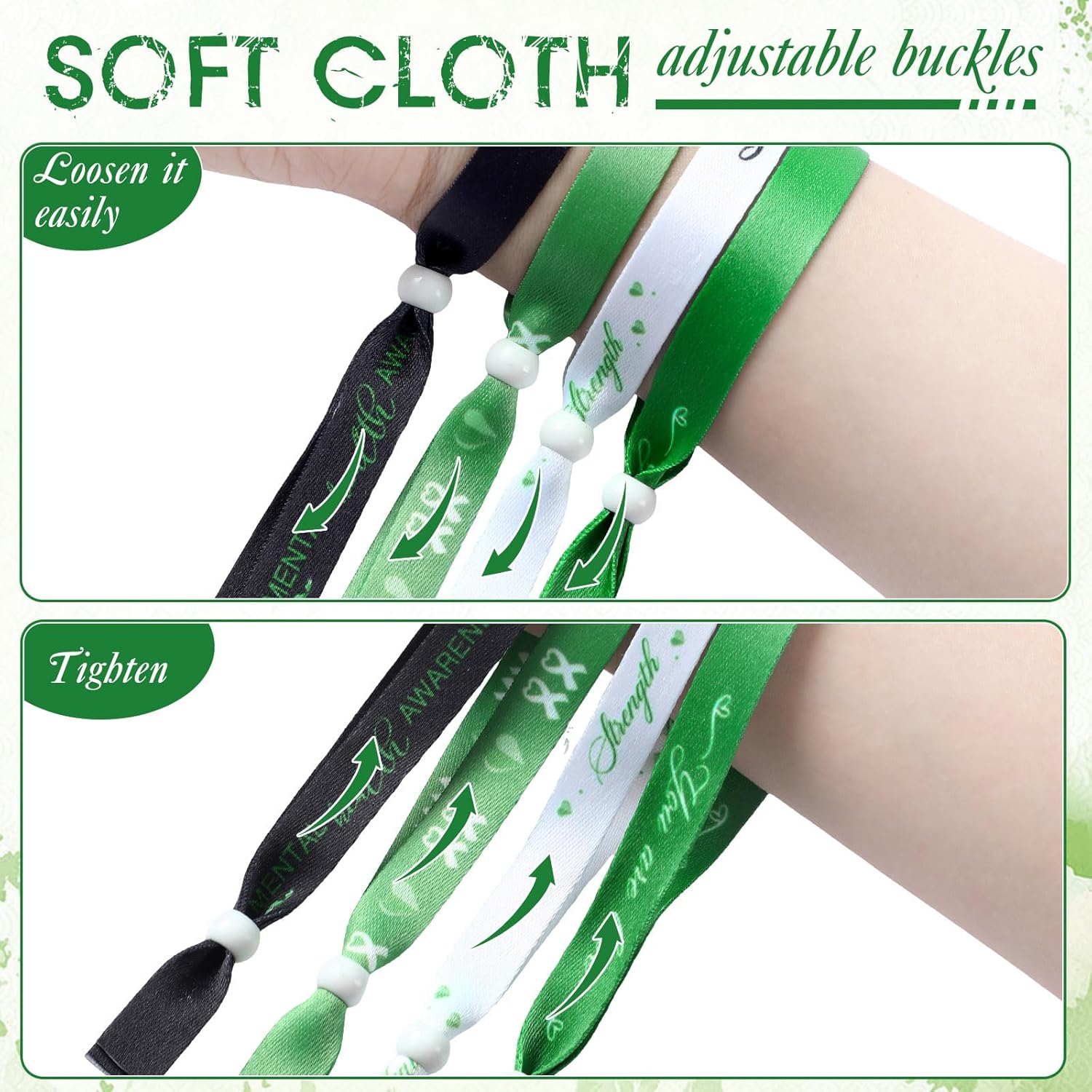 Features: Easy to match The classic colors and minimalist design make it easy to pair with most outfits. Whether it's an outdoor adventure, athletic event, or a daily casual look, they anchor the style with a touch of elegance. Thoughtful gifting: Our mental health awareness bracelets make for thoughtful gifts. Present them to your loved ones, to those overcoming challenges, or people dedicated to debunking the misconceptions around mental health. Specifications: Main material: polyester Main color: green Size: about 13.78 inches/ 350 mm total length, 6.69 inches/ 170 mm folded length, and 0.47 inch/ 12 mm wide Package includes: 200 x Mental health motivational wristbands Notes: Manual measurement, please allow slight errors on size. The color may exist a slight difference due to different screen displays.