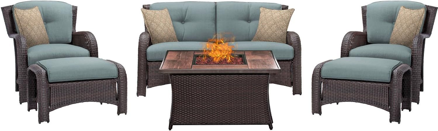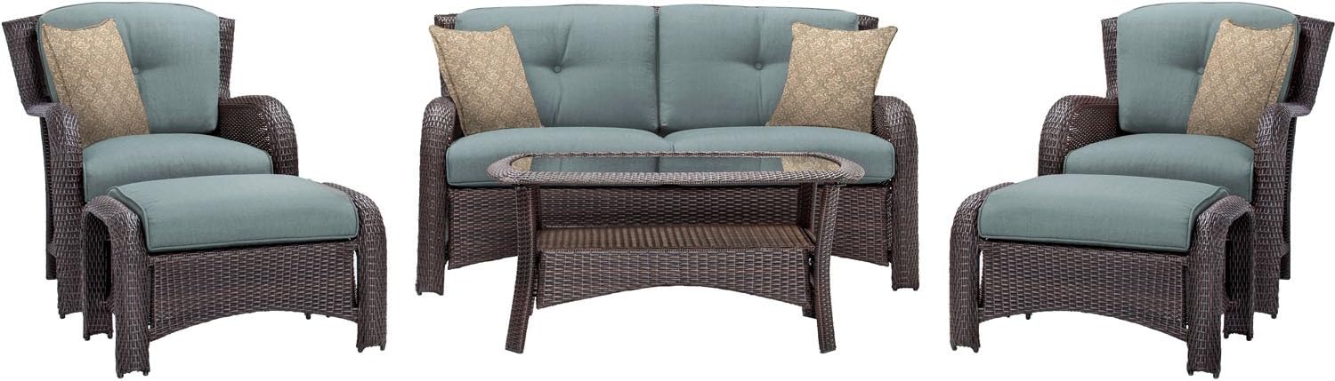Experience ultimate comfort and style with the Strathmere 4-piece conversation set from Hanover. This exquisite deep-seating set is designed to transform your outdoor space into a luxurious retreat. It includes one sofa, two swivel chairs, four accent pillows, and a coffee table with a convenient storage shelf. Each piece in this set is meticulously crafted with reinforced steel frames and 100% hand-woven resin strapping, providing unmatched all-weather durability. No matter the elements, this set will remain intact and retain its beauty for years to come. The thick foam cushions, wrapped in premium olefin, offer an indulgent seating experience. These cushions dry quickly and resist stains, water, and UV harm, ensuring they maintain their shape and remain vibrant and comfortable. With multiple color options available, you can easily coordinate the set to match your personal style and preferences. Built to withstand the test of time, this lounge collection is a long-term investment in both quality and comfort. Whether you're lounging alone or hosting gatherings with loved ones, sink into the relaxed comfort of this outdoor set and enjoy valuable moments in a space that exudes elegance and relaxation. Rediscover the joy of outdoor living with the Strathmere patio set by Hanover.