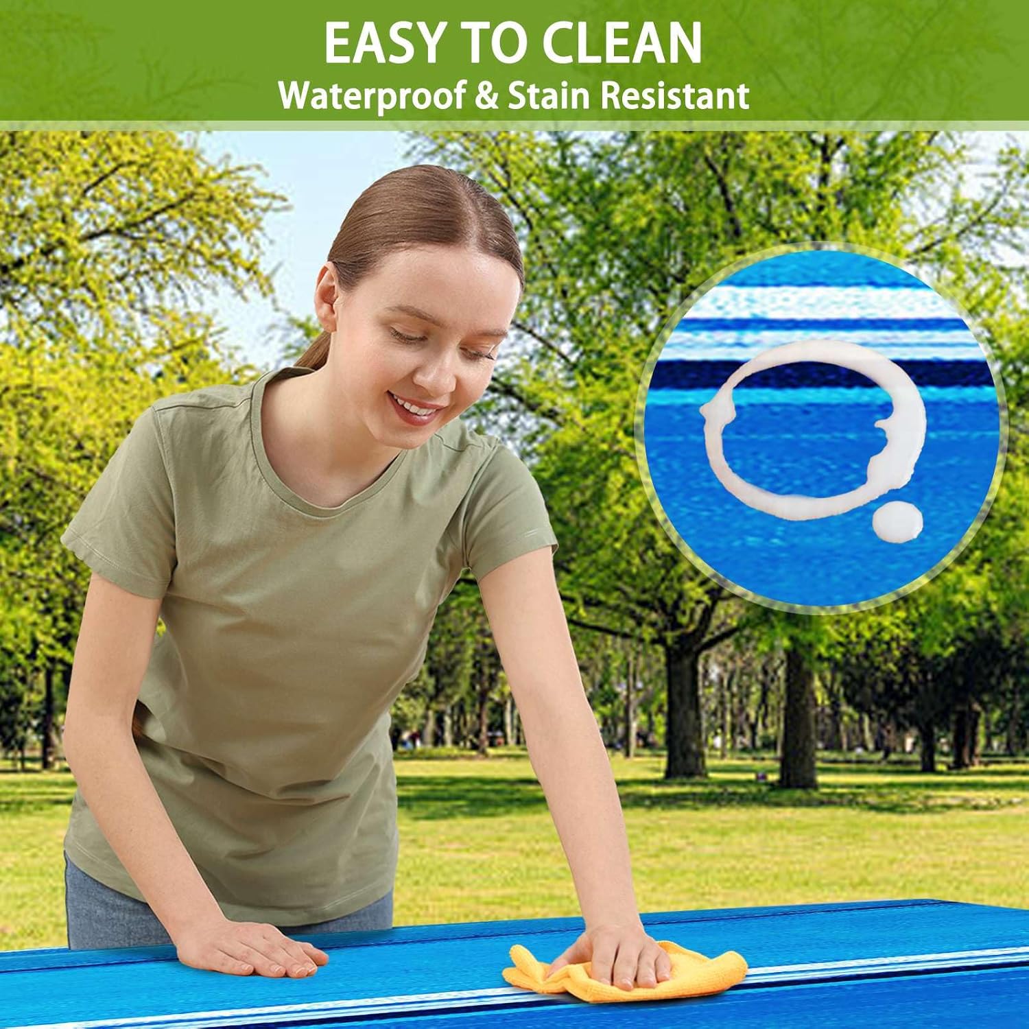 A perfect choice for any outdoors dining, BBQ, Grilling or lakeside picnics!Package Includes:1 x Picnic table cover2 x Bench covers1 x Beautiful drawstring bagSpecification:Our tablecloths come in three sizes to fit the most common size picnic tables. 5ft, 6ft and 8ft.5FT - Suitable For: 60" x 30" table, 60" x 12" bench6FT - Suitable For: 72" x 30" table, 72" x 12" bench8FT - Suitable For: 96" x 30" table, 96" x 12" benchMaterial: Soft and smooth 100 percent polyester.Easy to clean and reusable. Paired with a spill proof and waterproof coating, you can fully enjoy your meal with loved ones without a care in the world! A few wipes are all you need to clean.Features:Our tablecloth and bench covers have a snug and secure fit. The elastic corners secure the table and bench covers against strong winds. No clips are required. Enjoy your picnics, RV and camping trips, parties, and BBQ with ease and well being.Don't worry if the liquid falls on the tablecloth, you just need to wipe it with a damp cloth. Of course, table protector is hand washable. Suitable for all seasons, this will be your best choice for your room or upcoming party.We made unique designs so you. And with its vivid and beautiful colors, your table will never look boring again.Our picnic table cloth and bench covers feature a durable drawstring bag, very convenient for you to take your picnic cover to park or seaside. Every time you finished your picnic activity, this drawstring bag helps your to pack all the picnic table cloth and bench covers together.Going on a picnic by the lake on Sunday? Preparing for some party with friends? Or bonding with your kids through fun and creative art projects? Whatever your special occasion may be, our table covers with elastic are perfect for you.