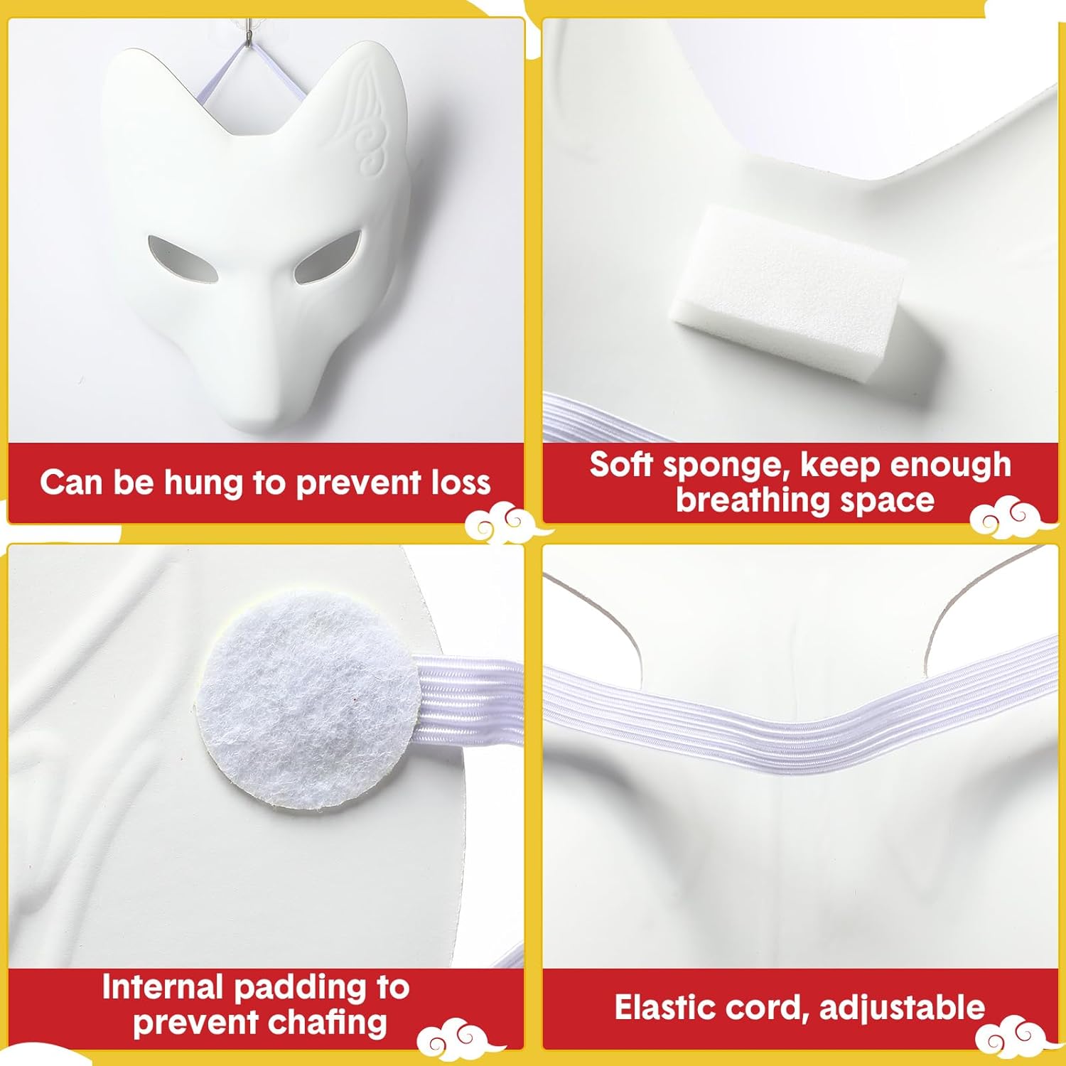 Features: Comfortable to wear: The mask material is PU material, soft and skin friendly, and equipped with elastic cord, which is more comfortable to wear. Multi usage: Japanese mask is suitable props for cosplay, masquerade, Christmas party, performance dance makeup, and also as a novel decoration for taking selfies and photos with families and friends. Halloween decorations: The fox mask can also be acted as a decoration after DIY and hung it on the wall to display it, celebrating Halloween party. Specifications: Material: PU leather Color: white Size: one size/ about 11 x 7 inches/ 29 x 18 cm Weight: about 0.13 lb/ 60 g Package includes: 12 x Fox masks Notes: Manual measurement, please allow slight errors on size. The color may exist a slight difference due to different screen displays.