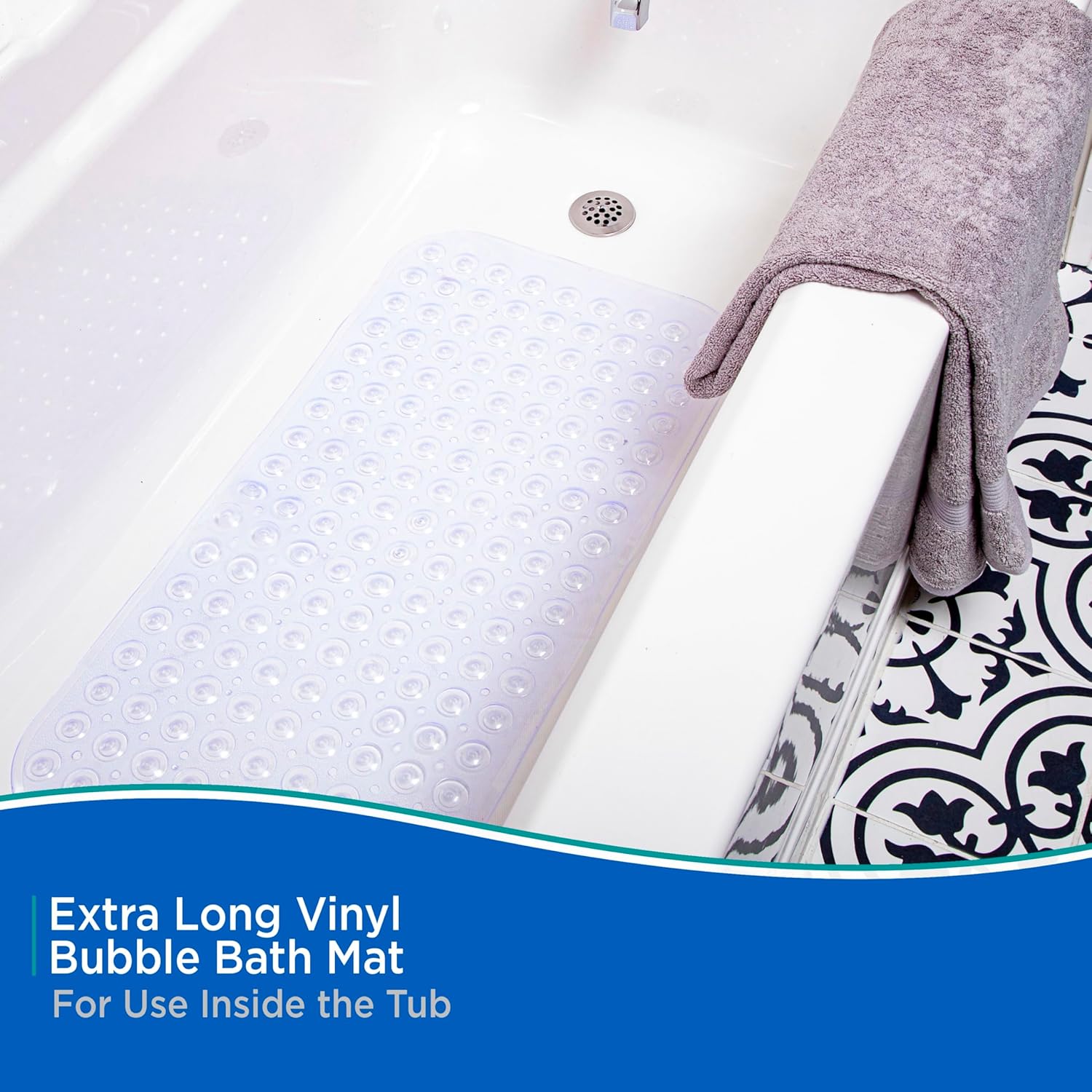 The Kenney Extra Long Bubble Bath Mat in clear is an ideal solution for inside your bathtub or shower. Suction cups on the bottom help to keep the mat in place. The mat has a soft bubble texture on the surface for comfort. Measuring 18 inches wide by 36 inches long (46 cm x 91 cm), it should be used on smooth surfaces as suction cups may not stick well to textured surfaces or textured tile.Mat and tub surfaces should be clean and free of soap or bath oil before each use. Wet floor of tub or shower for better suction. Place mat in desired position and press firmly to adhere suction cups to the surface. Not for use on textured surfaces.