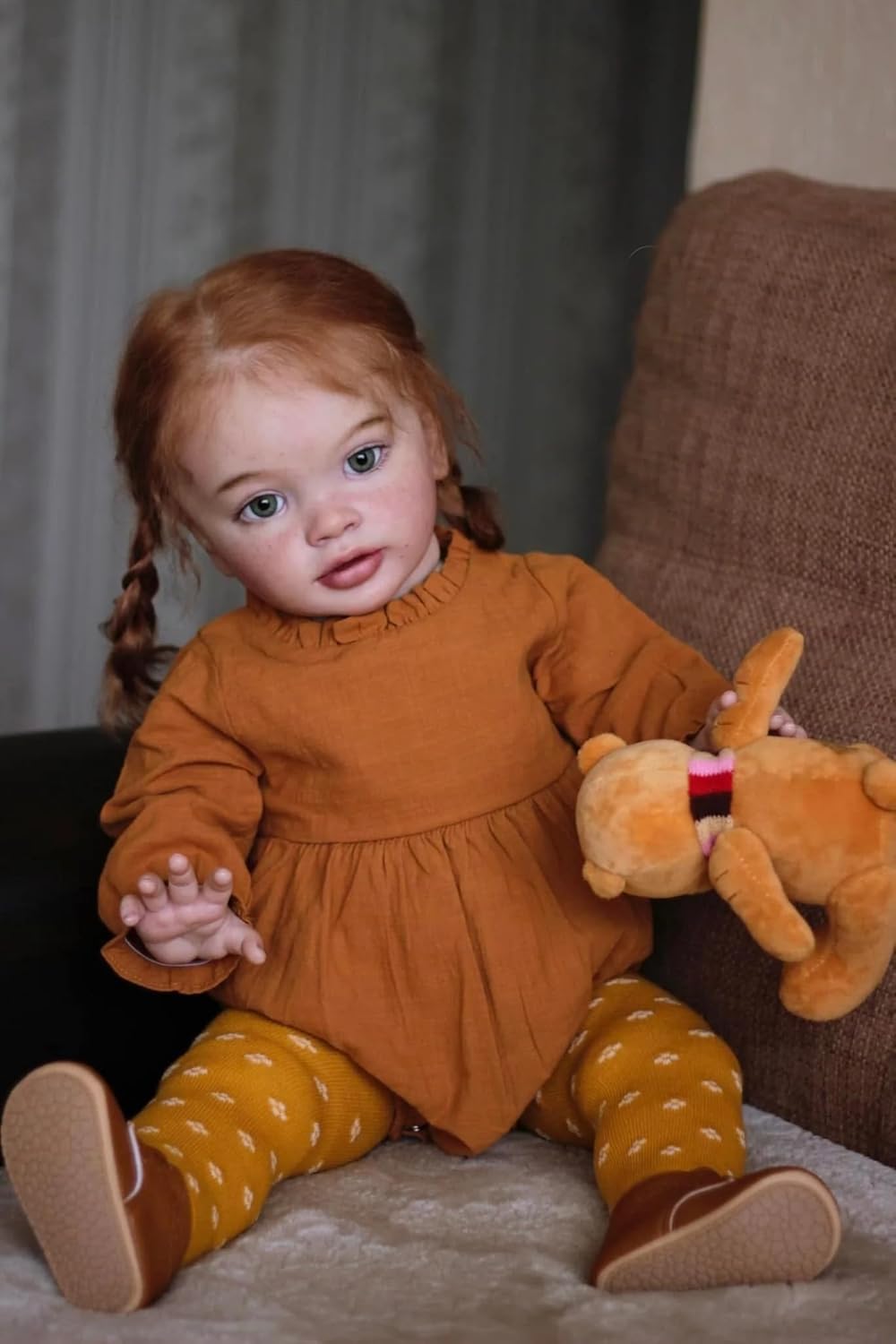 SAFETY CERTIFICATION - Conforms or exceeds the safety requirements of ASTM F963 and EN71 for ages 3+, which is safe for your children. This darling little doll arrived today just when expected. She came with a bottle and magnetic pacifier and the same clothes she is pictured wearing. Pretty headband, t-shirt, diaper, romper shorts and really nice thigh high cable knit stockings. She is a good sized doll but has very bent, curved legs so she doesn't seem really long. She has a fair weight to her and is well stuffed and sits up very well on her own. Her limbs all move, up and down. She has well rooted, soft, fine, slightly wavy auburn hair. She has beautiful blue eyes, nice natural looking lashes and adorable freckles across her nose and cheeks. Her painting is quite beautiful, so well blushed, veined and mottled. Her nails are painted and tipped very well. She's a very pretty baby. ; Product Description: Baby Doll Size : 26 inch (66cm) ; Weight: the net weight of the doll is around 1.7KG, 3.4LBS Material : This realistic Baby doll's shoulder and body are cloth with internal filling PP cotton, full vinyl arms, and full vinyl legs; The body has no gender. The limbs are movable. Reborn baby doll is able to sit up and lie down easily on her own, but CANNOT stand, speak or be washed. Eyes: High quality clear acrylic eyes, the eyes can not blink; Hair : hand rooted high quality fiber hair. realistic, Clothes : her fits into 6-9 month sized baby clothing and is a lovely girl;