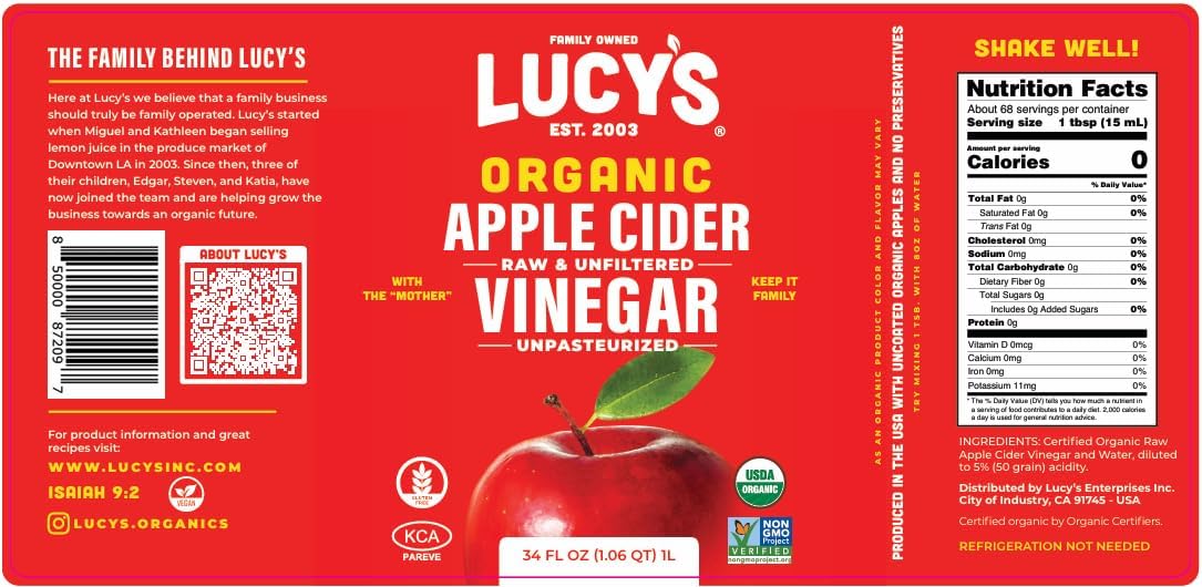 WHAT MAKES “The Mother” SPECIAL? This Organic Apple Cider Vinegar’s thick dark amber color observable in our photos is a result of bacterial cultures and dietary fibers which mix together to form an ultra-pure, premium, authentic “mother” that rests on the bottom of the bottle. This highly sought after, “mother” generates strands of proteins, enzymes, and friendly bacteria in the ACV! Here at Lucy’s we strive to make sure that every single bottle of Apple Cider Vinegar with mother contains a thick strand of these good bacteria to prevent a ‘watered-down’ version in order that each customer is able to receive the full benefits that the mother brings!
