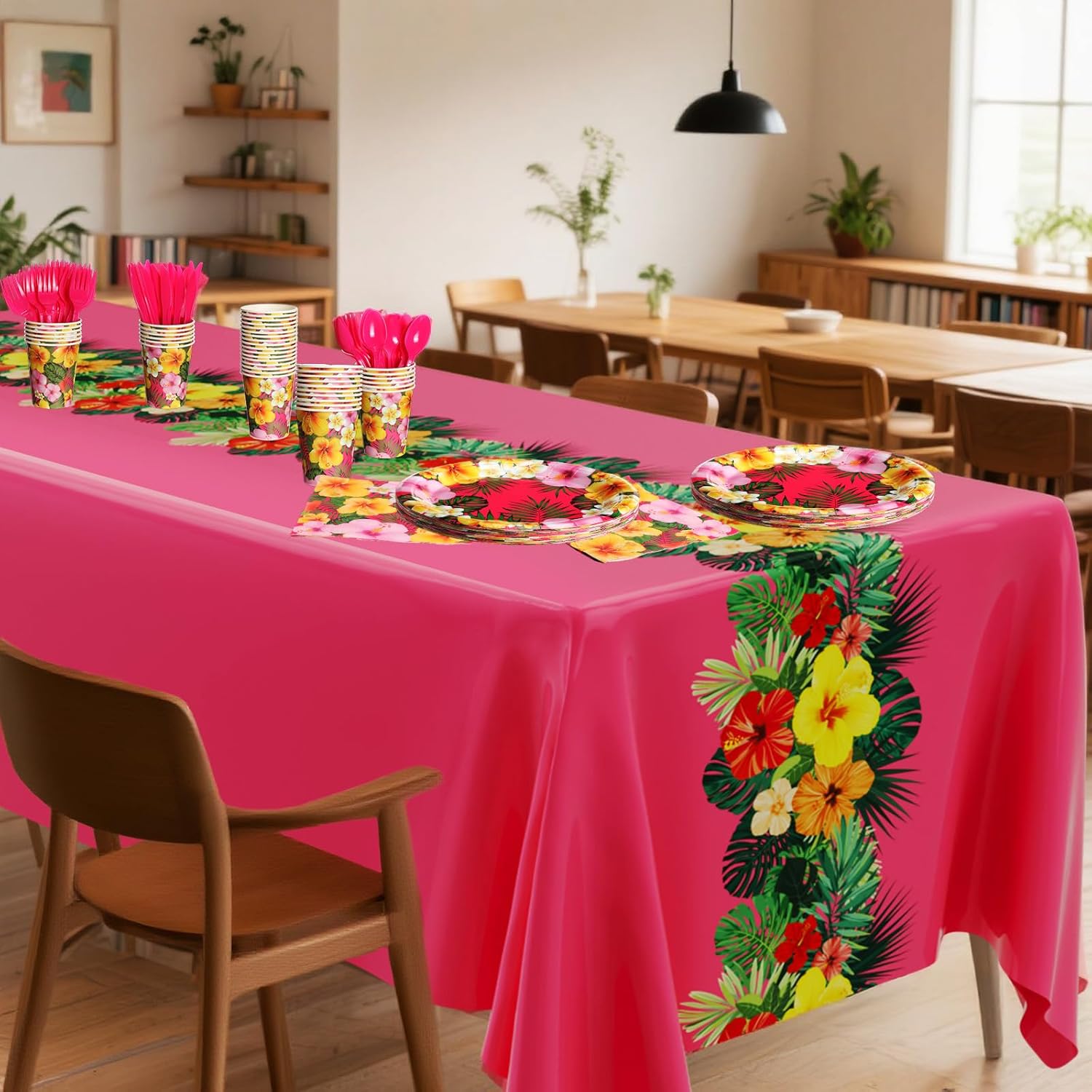 Features: Disposable options with our hibiscus floral paper plates and Hawaiian paper napkins. They're not just easy on the environment but also make post party cleanup fast. Stand out with the bright colors in our set. From the Hawaiian paper plates to the tropical luau fork, each item brings bold hues to your table setting, ensuring your event is lively and visually striking. Specifications: Material: paper, plastic Color: bright color Size: Hawaiian theme tablecloth: 107.9 inches x 53.9 inches/ 2.7 M x 137 cm Package includes: 2 x Hawaiian print tablecloths, 20 x 9 inch plates, 20 x 7 inch Hawaiian paper plates, 40 x Hawaiian paper napkins, 20 x tropical cups, and 20 x rose red knives, 20 x rose red spoons, 20 x rose red forks Notes: Manual measurement, please allow slight errors on size. The color may exist a slight difference due to different screen displays