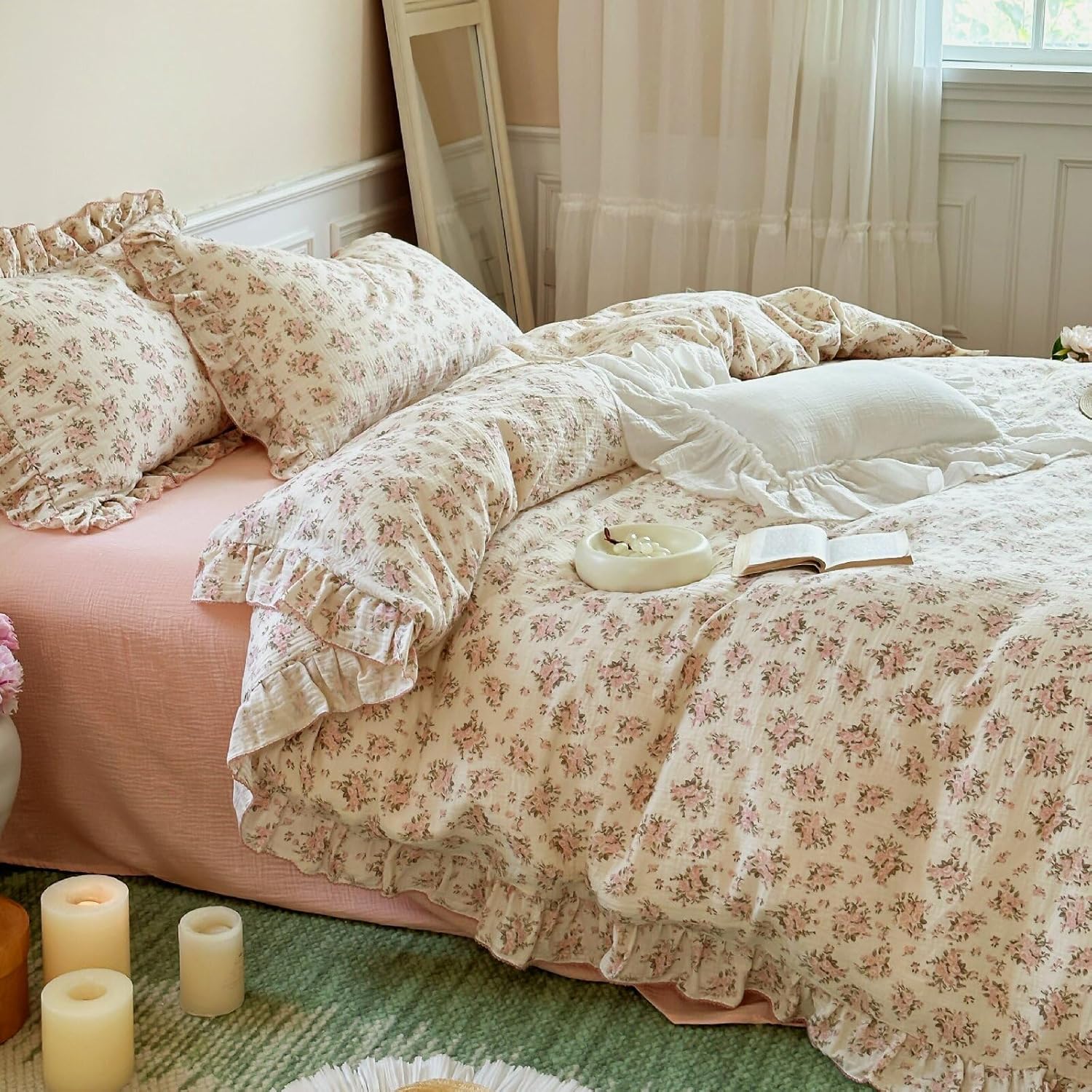 4 Pieces shabby chic pink peony floral print bedding set includes 1 pc muslin cotton duvet cover full size (79"x 90"), 2 pcs muslin cotton pillow cases standard size (20"x 26"), 1 pc lightweight duvet insert full size (79"x 90"). Suit for children teens full size bed.