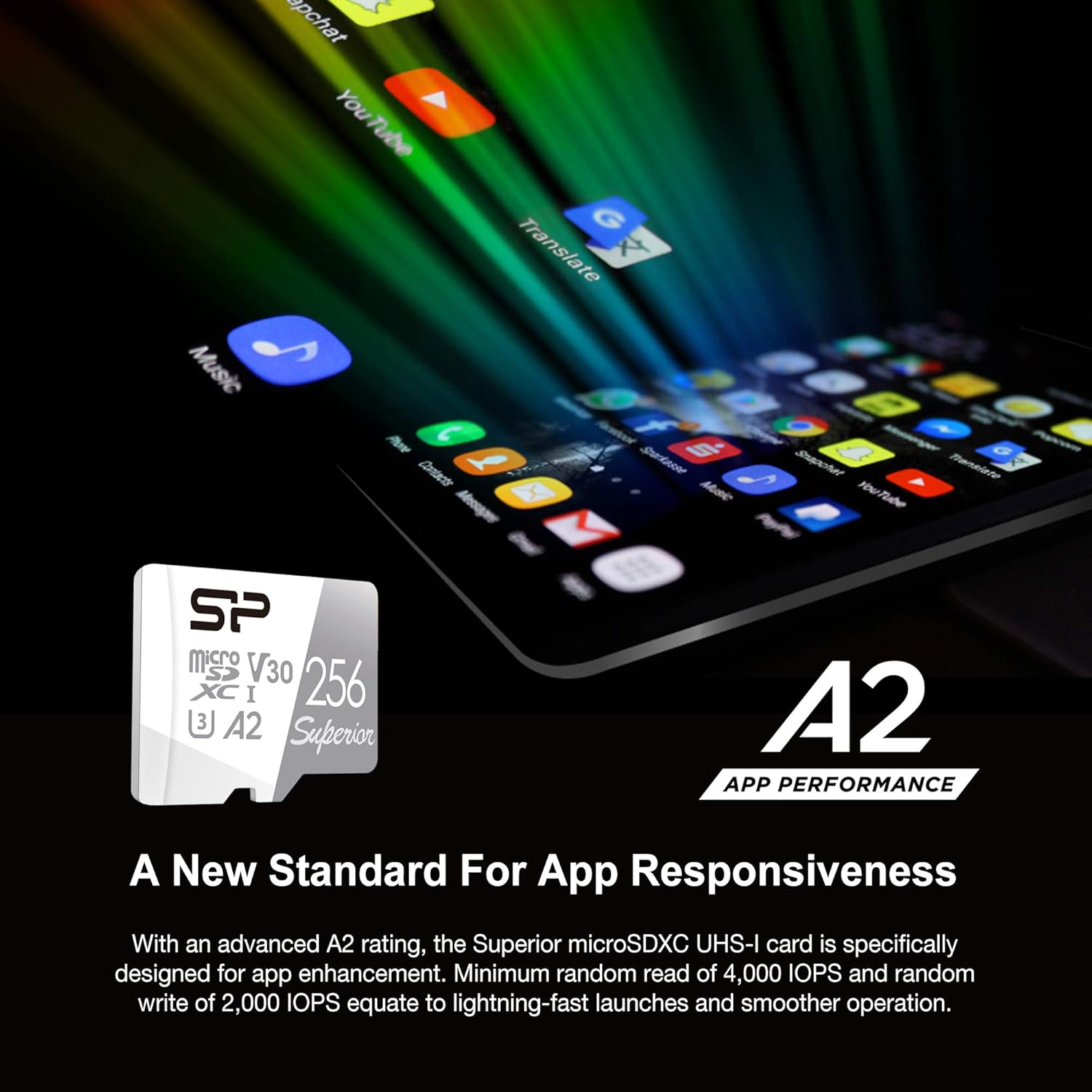 A New Standard For App Responsiveness [Product Features] [ ] With an advanced A2 rating, the Superior microSDXC UHS-I card is specifically designed for app enhancement. Minimum random read of 4,000 IOPS and random write of 2,000 IOPS equate to lightning-fast launches and smoother operation. This translates to an overall superior user experience on your Android-based smartphone, tablet, and other app-running mobile devices. It also saves internal storage space on your device. [4K Ultra HD Never Looked So Good] With UHS Speed Class 1 (U3) and UHS Video Speed Class 30 (V30), the Superior microSDXC UHS-I card allows you to capture uninterrupted 4K Ultra HD videos. Read and write speeds up to 100 and 80 MB/s, respectively, ensure that youâre spending more time recording every bit of the action in stunning quality. [Enough Capacity For All Of Your Needs] Whether you're looking to store data on your digital camera, smartphone, drone, portable game console, tablet, or another device, the Superior microSDXC UHS-I card can fulfill all of your needs. With up to 256GB storage capacity, it can store up to 39,400 songs, 75,200 photos, or 12 hours of 4K Ultra HD video. [ALL-ROUND DATA PROTECTION] Even if you are doing outdoor activities in some extreme climate conditions, the Superior series can still survive from water, shock and wide-temperatures storage ranging from -40ÂșC to 85ÂșC! Moreover, the Superior series is immune to airport X-rays so there is no need to worry when traveling overseas. 5-year warranty. [Product Specifications] DimensionïŒ0.6 x 0.4 x 0.1 inch WeightïŒ0.02oz/ 0.0013lb2.7V - 3.6V Performance Read/Write (max.)ïŒ100/80 MB/s MTBFïŒMore than 1,000,000 hours DurabilityïŒ10,000 insertions (minimum) Operating temperature: 0ÂșC~70 ÂșC Storage temperature: -40ÂșC~85ÂșC Humidity: 8%~95% Operation Voltage: *Compatible with microSDHC enabled host devices; not compatible with SD devices and SD readers. *Some of the listed capacity on a flash storage device is used for formatting and other functions and not available for data storage. The actual data storage capacity is less than what is listed on the product.