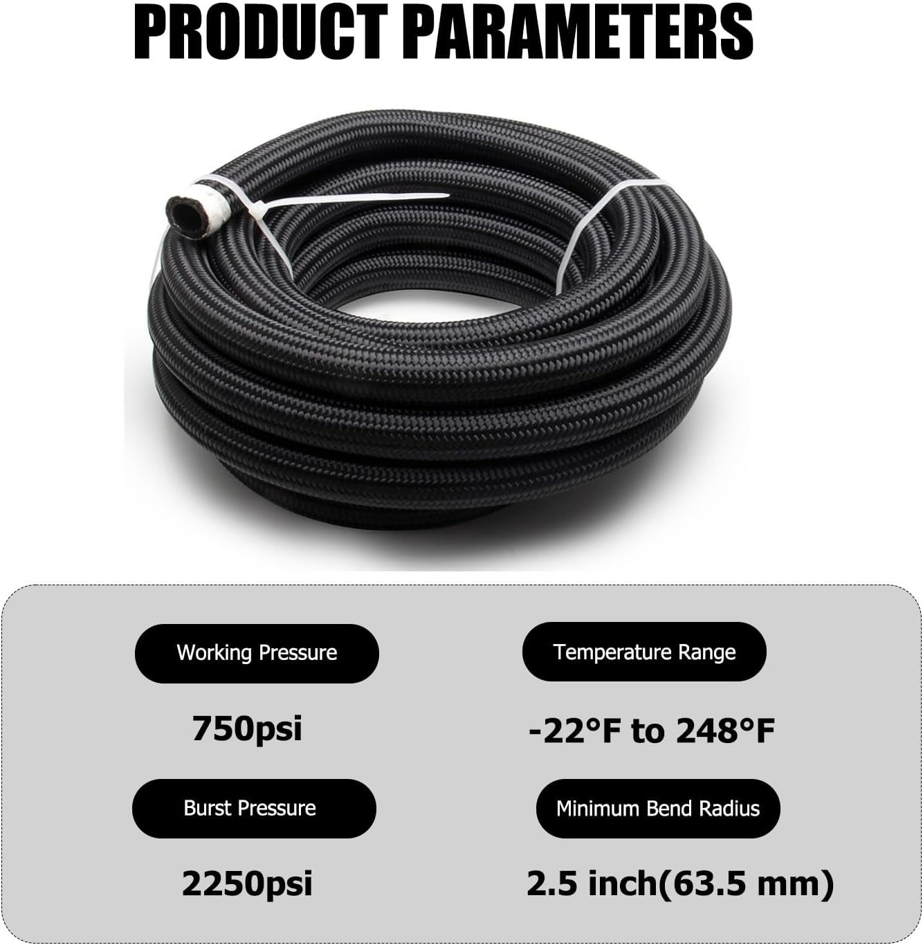 -High Performance Nylon Stainless Steel Braided Fuel HosesUpgrade your vehicle's braking system with premium braided hoses designed for European road conditions and demanding driving environments.--Precision engineering for safetyEach Fuel Hose features a three-layer construction with the following features:1. CPE core: Smooth surface minimises fluid turbulence for consistent pedal feel.2. Stainless steel braid: Increases burst strength (3 times that of rubber wires) while preventing expansion under high pressure.3. Reinforced nylon sleeve: Protects against abrasion and UV damage and maintains flexibility in temperatures ranging from -40°C to 260°C.--Seamless compatibility:This universal automotive fuel line Cold oil line is suitable for most cars, trucks, ATVs and motorbikes.--Why Choose Our Fuel Hose?✔️ Compliant with road regulations✔️ Robust and durable✔️ Performance EnhancementSie können absagen. Es tut mir leid.